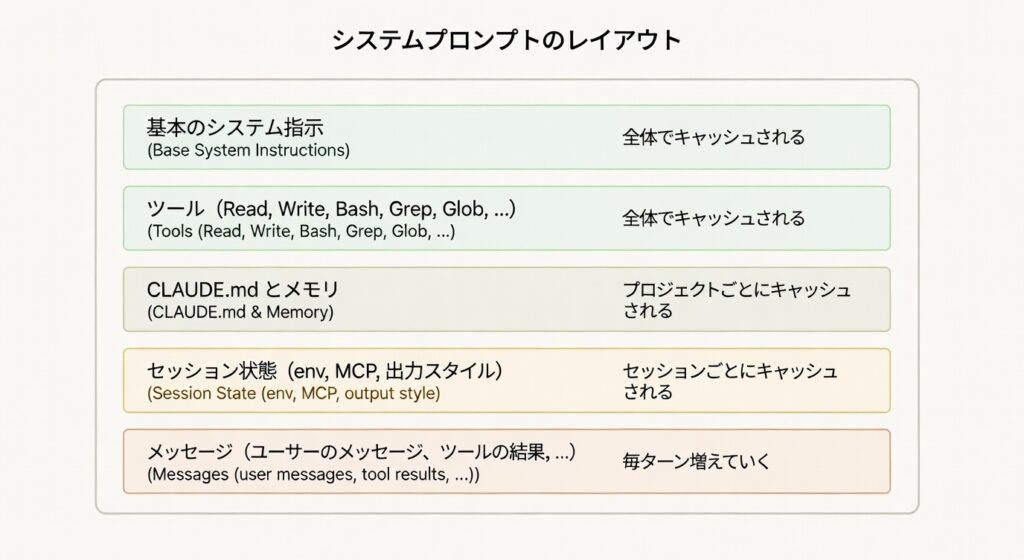 注意:この順序は意外に壊れやすいです。例として、静的システムプロンプトに詳細なタイムスタンプを入れたり、ツールの順序を非決定的に並べ替えたり、ツールのパラメータ(例:AgentTool が呼び出せるエージェント)を更新したりすると、キャッシュが無効になります。